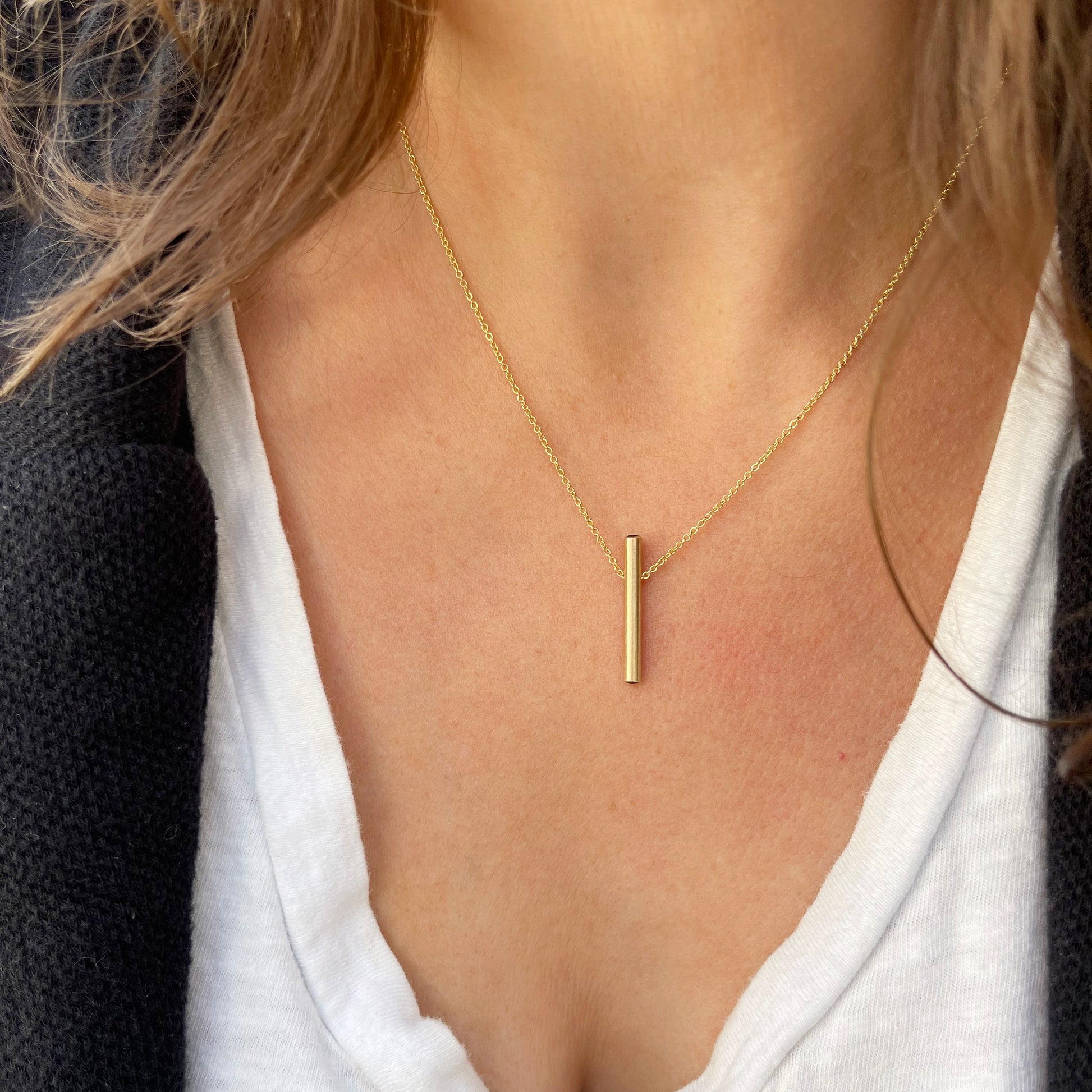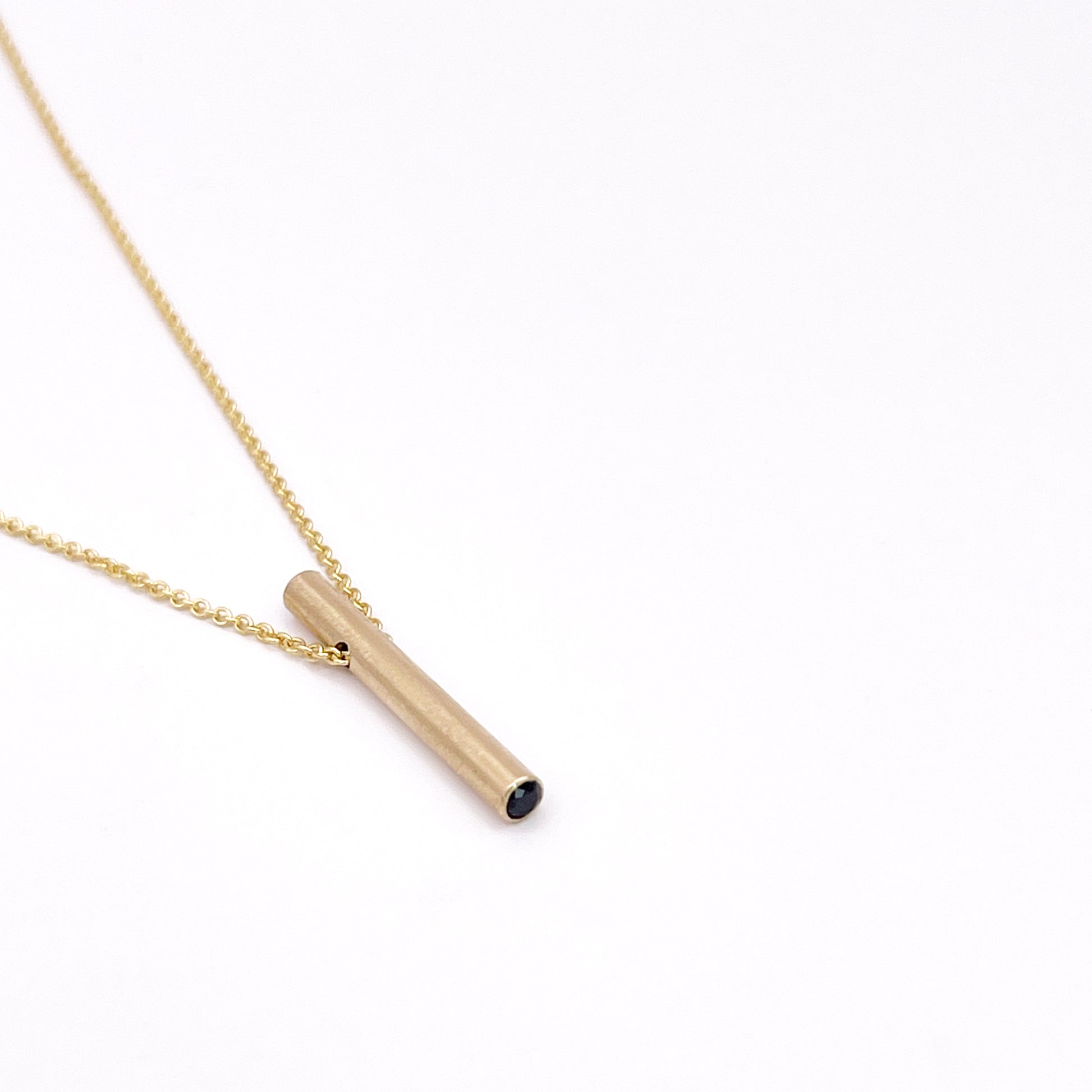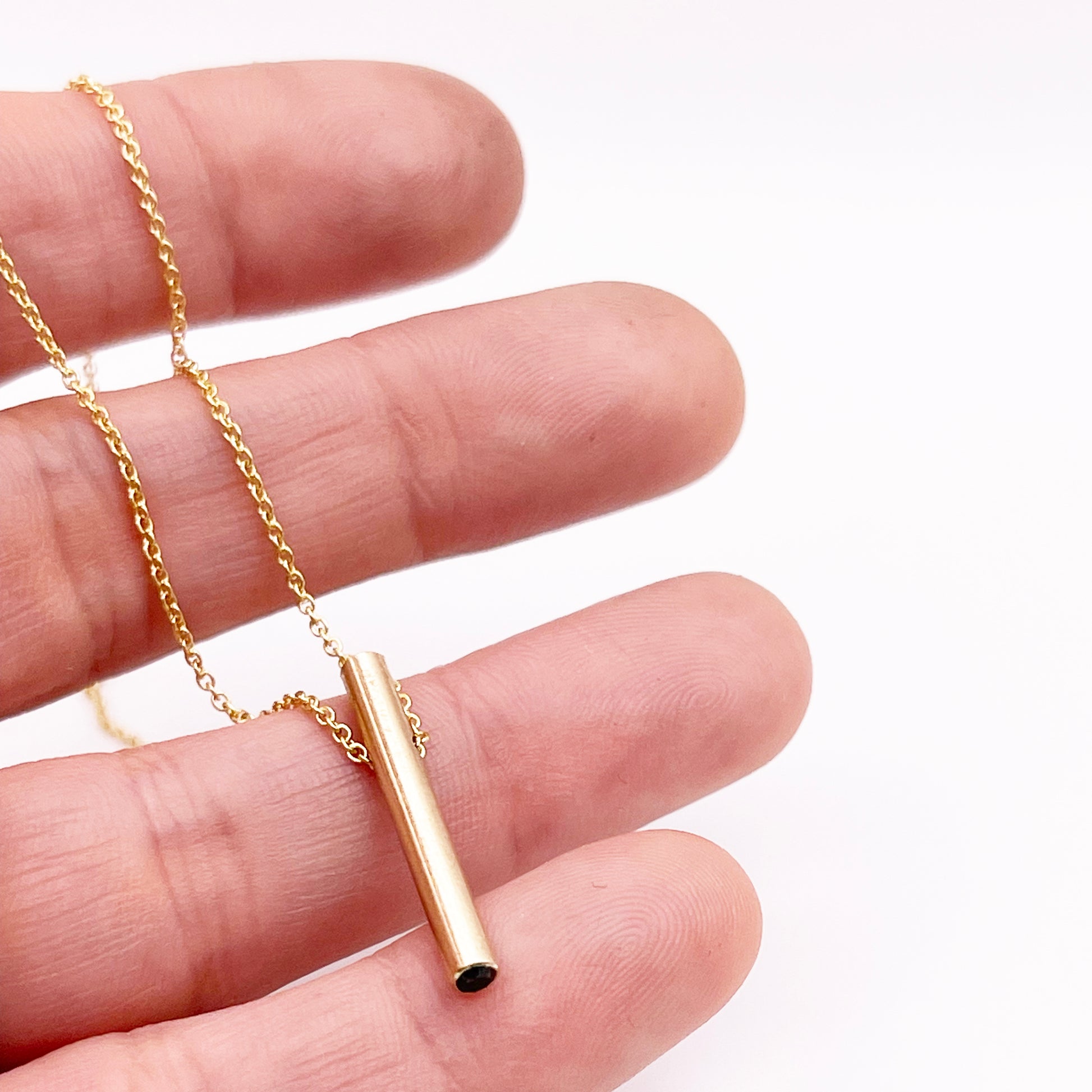 14k gold bar necklace with flush set gemstones on each end. Bar moves freely on 14k gold cable chain. Bar is approximately 1 inch in length. Chain is 18 inches in length.