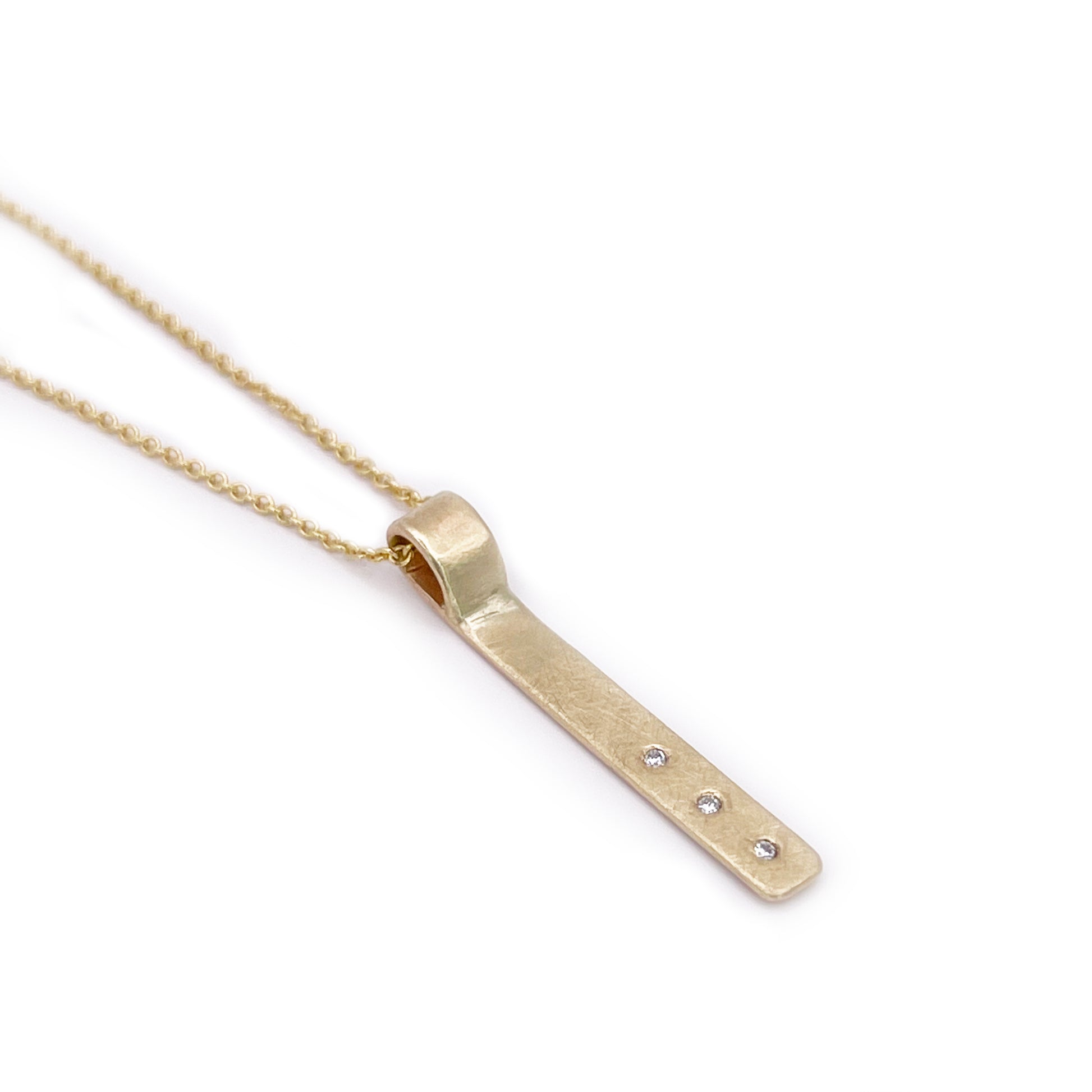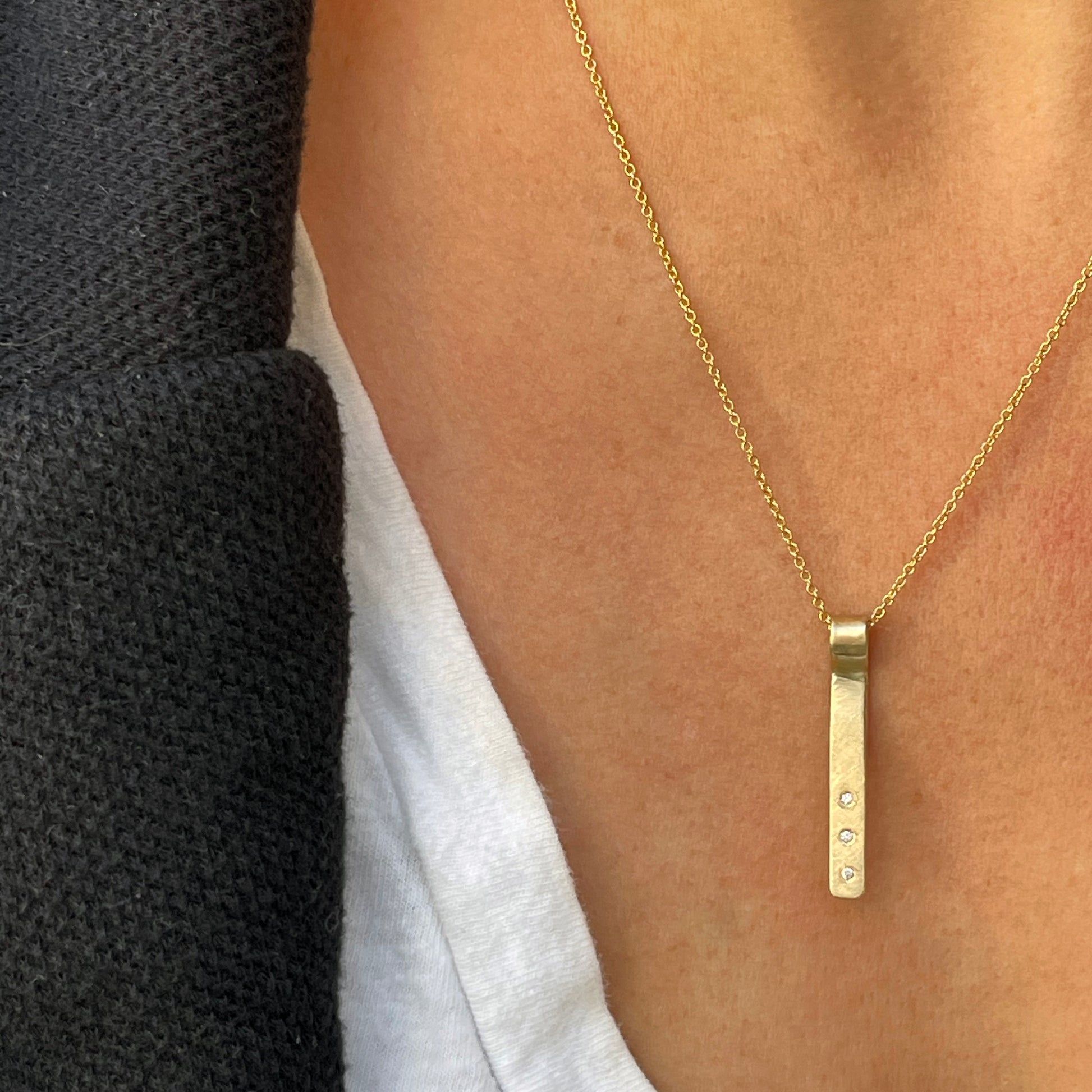 Solid 14k bar pendant with three flush set diamonds.